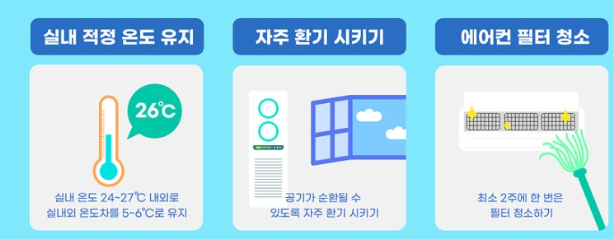 에어컨 사용 시간을 줄이고, 실내외 온도 차를 5°C 이내로 유지하는 것이 가장 중요합니다!